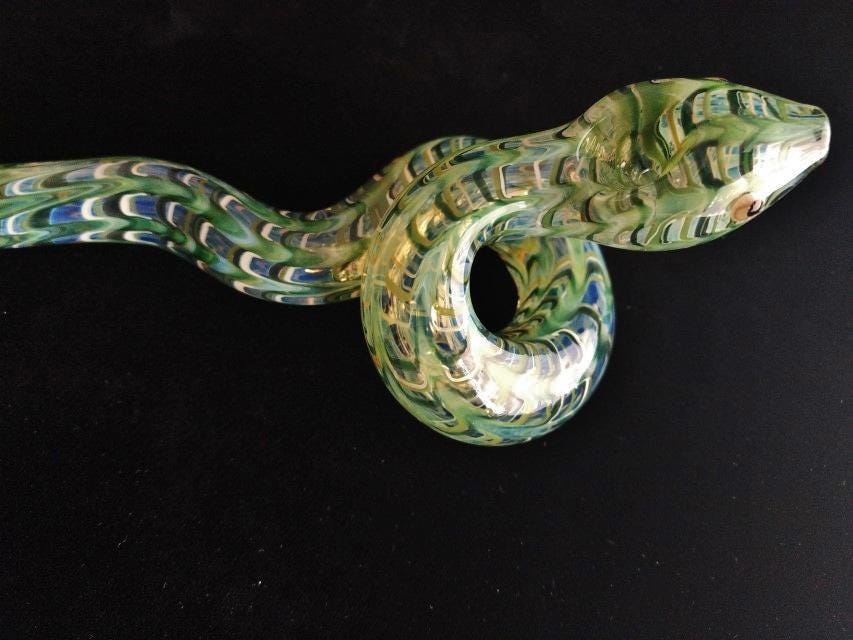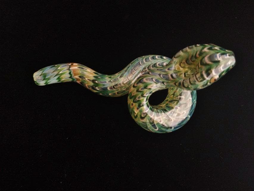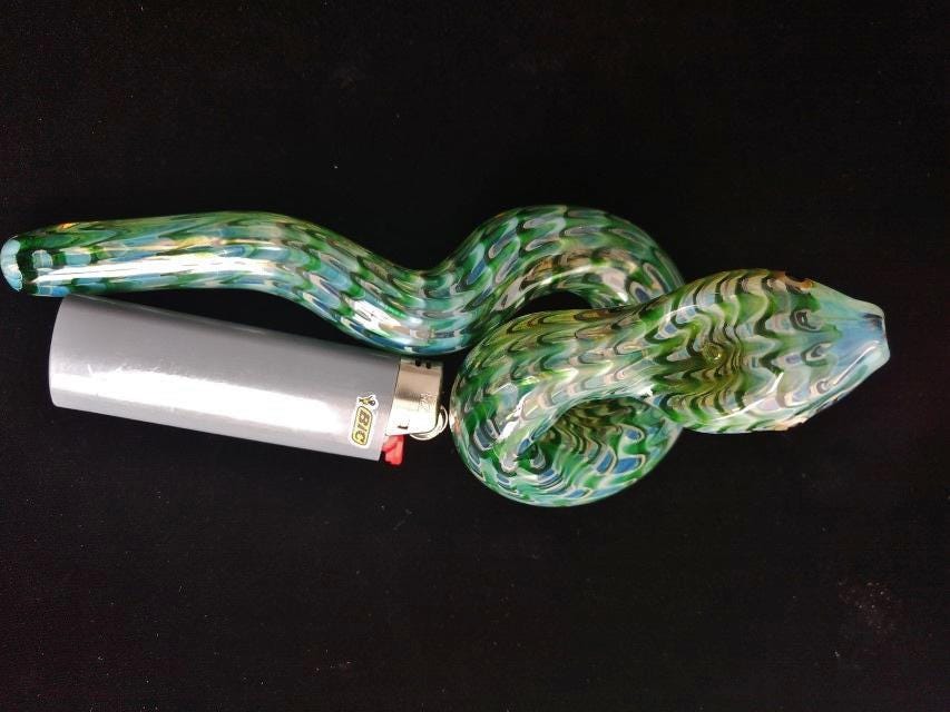 This colorful glass snake pipe seems ready to slither off the table. It has graceful curves, beautiful colors, and many details. If you could uncoil this, you would find that it's a longer pipe than you expected; it also gives a cooler smoke than expected because of its actual length (if it was uncurled). The lighter in the last photo is a standard sized Bic.
