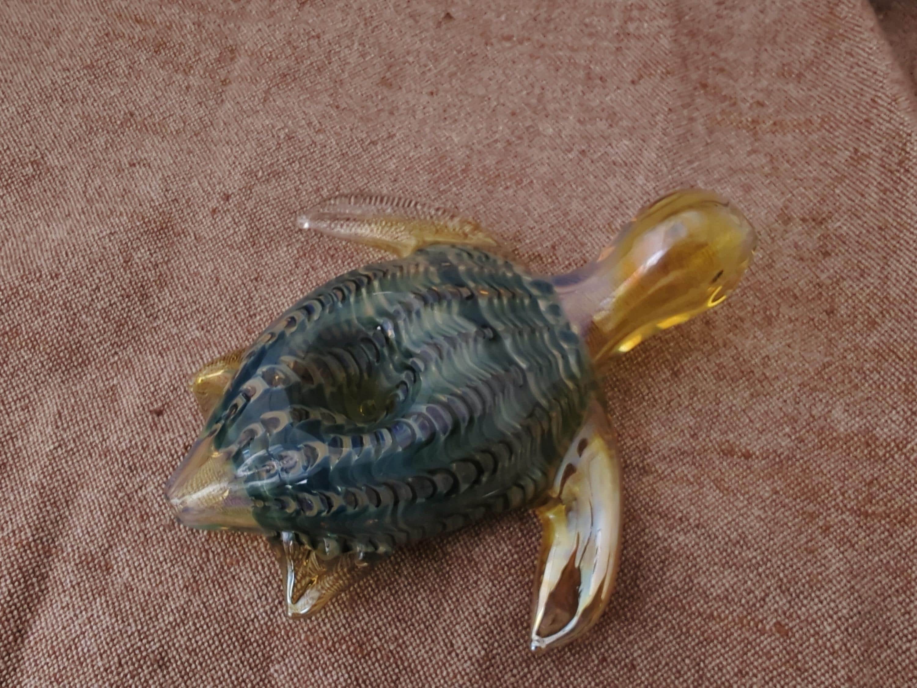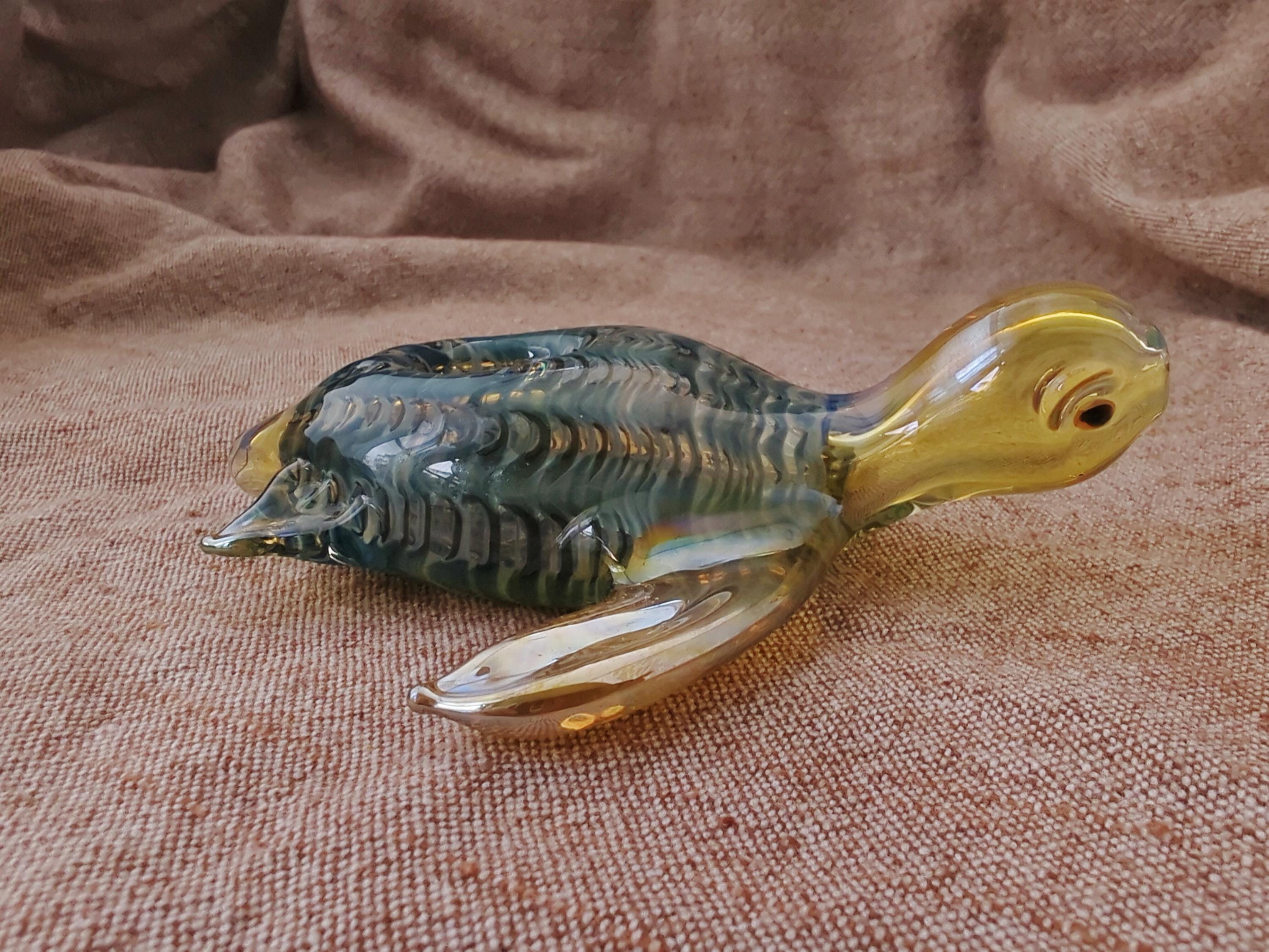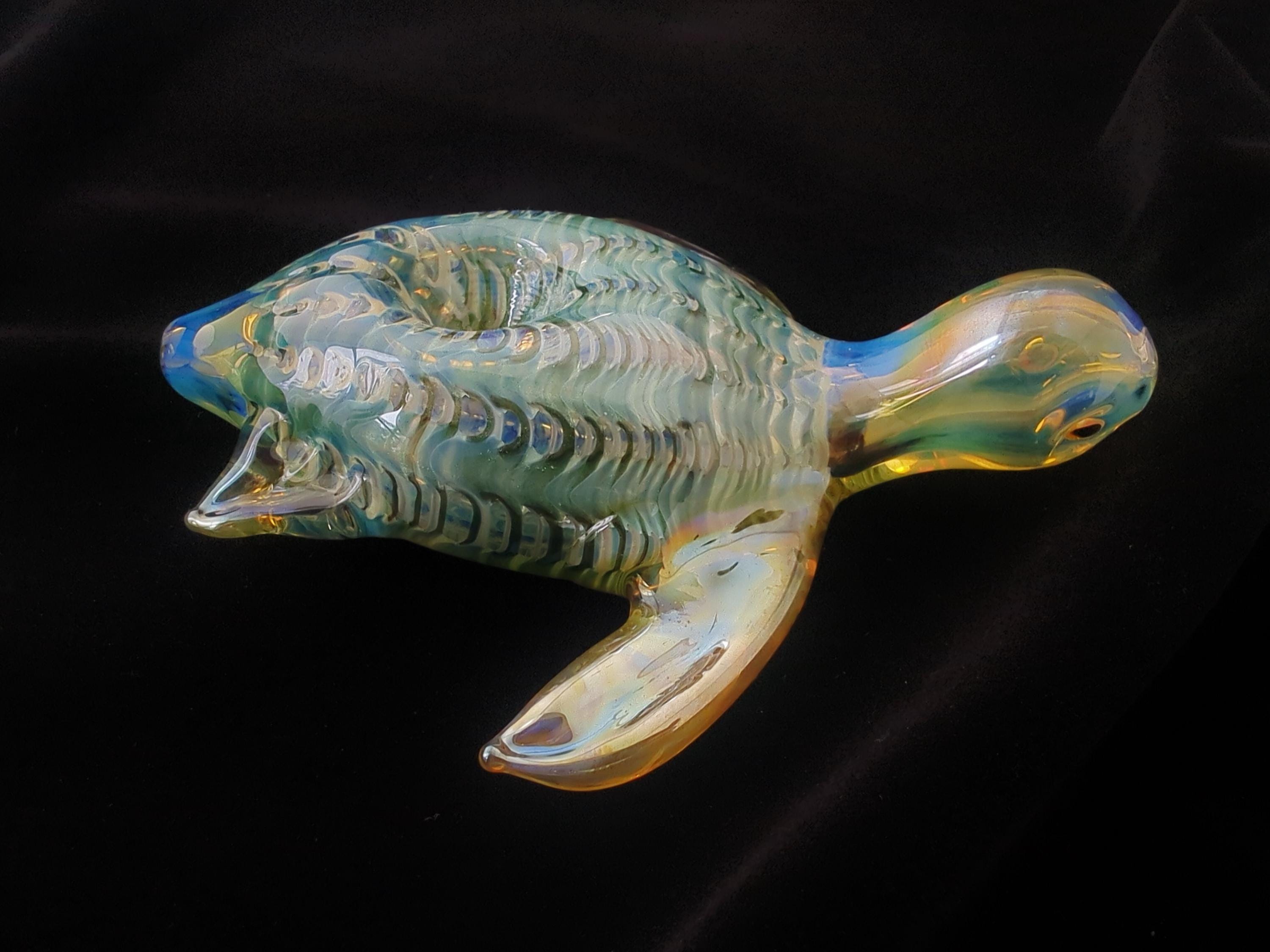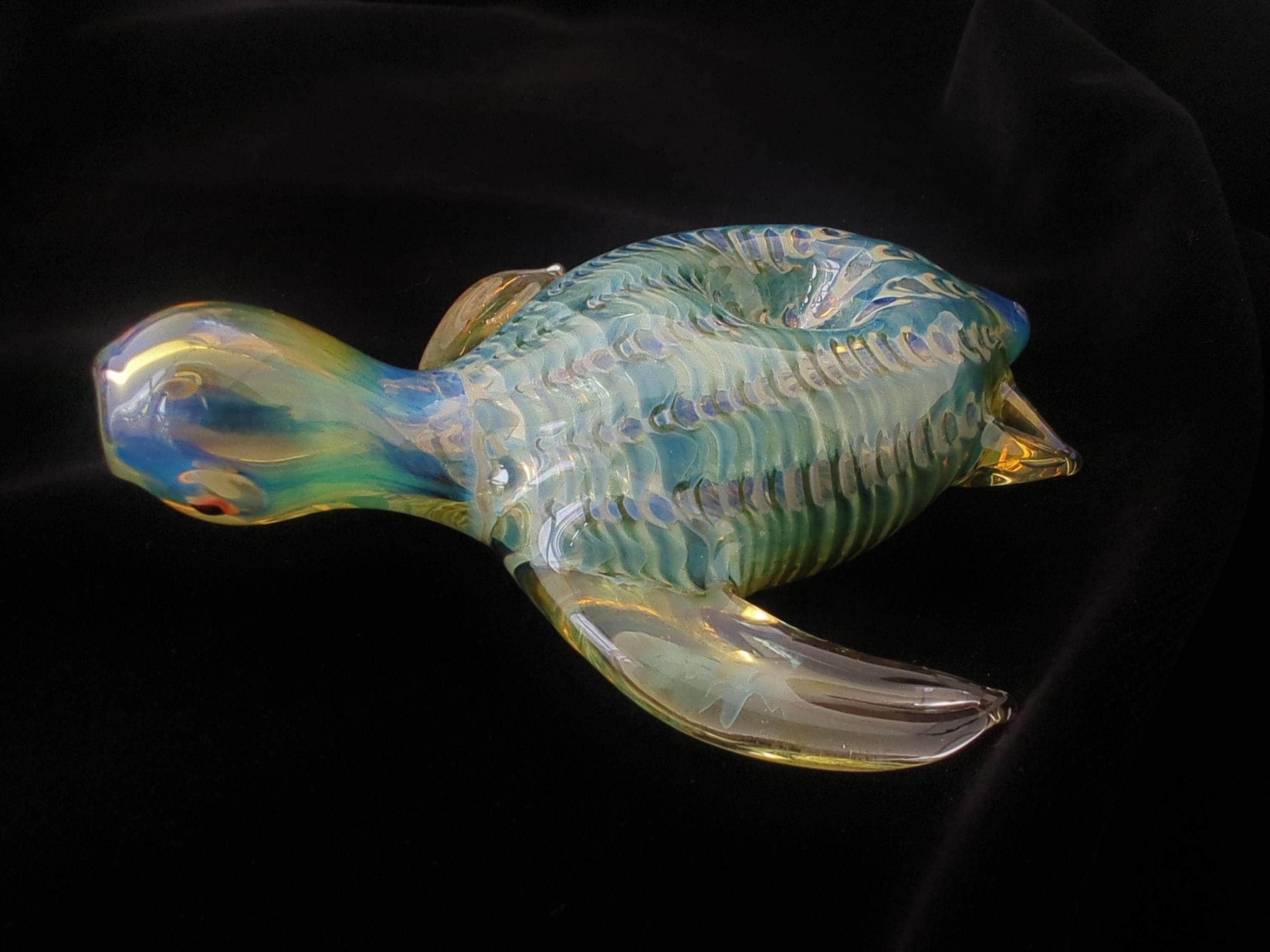 This beautiful, vibrant sea turtle pipe has been meticulously sculpted to include many fine details. Graceful fins and the many other details make it seem to be ready to swim away.