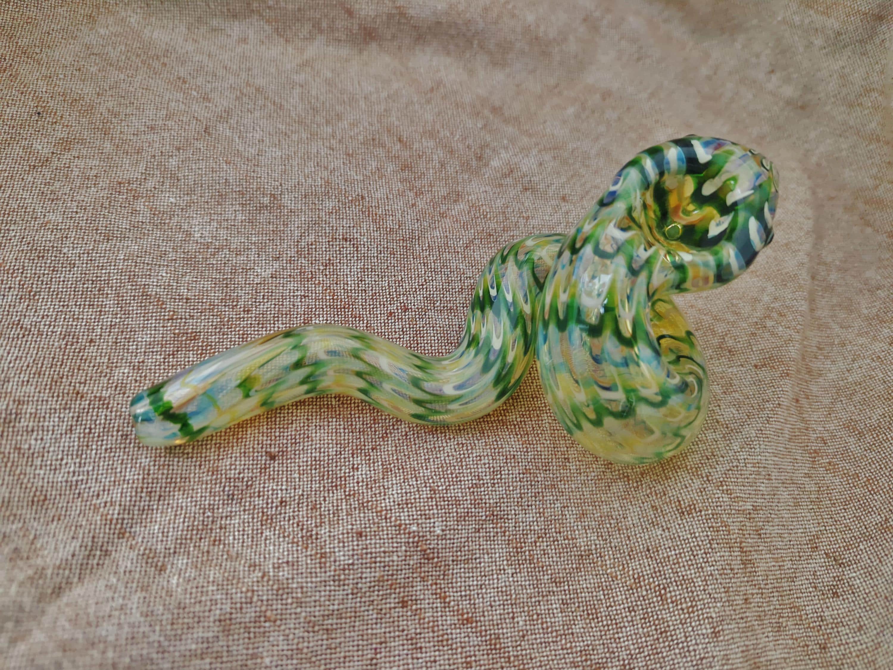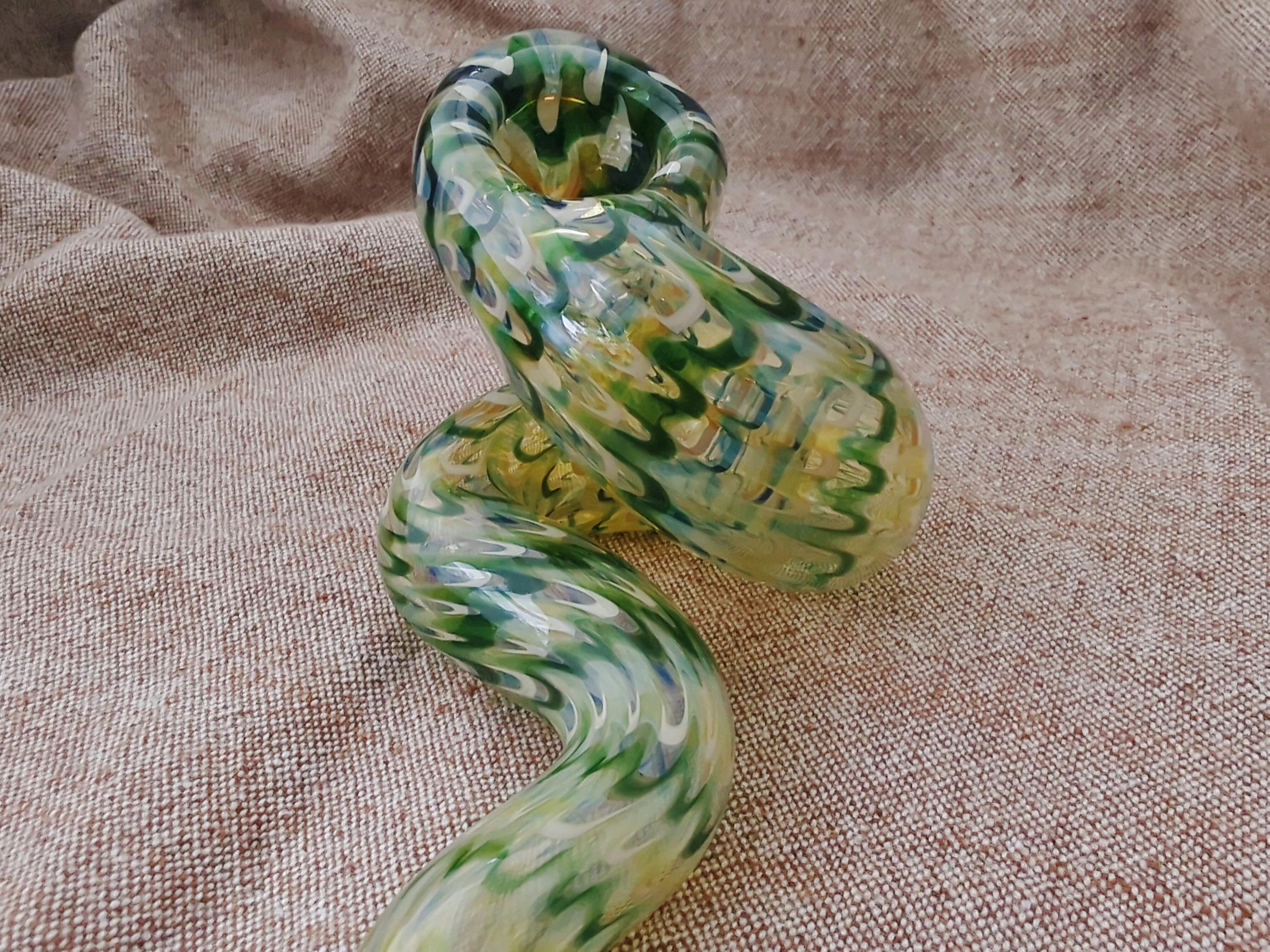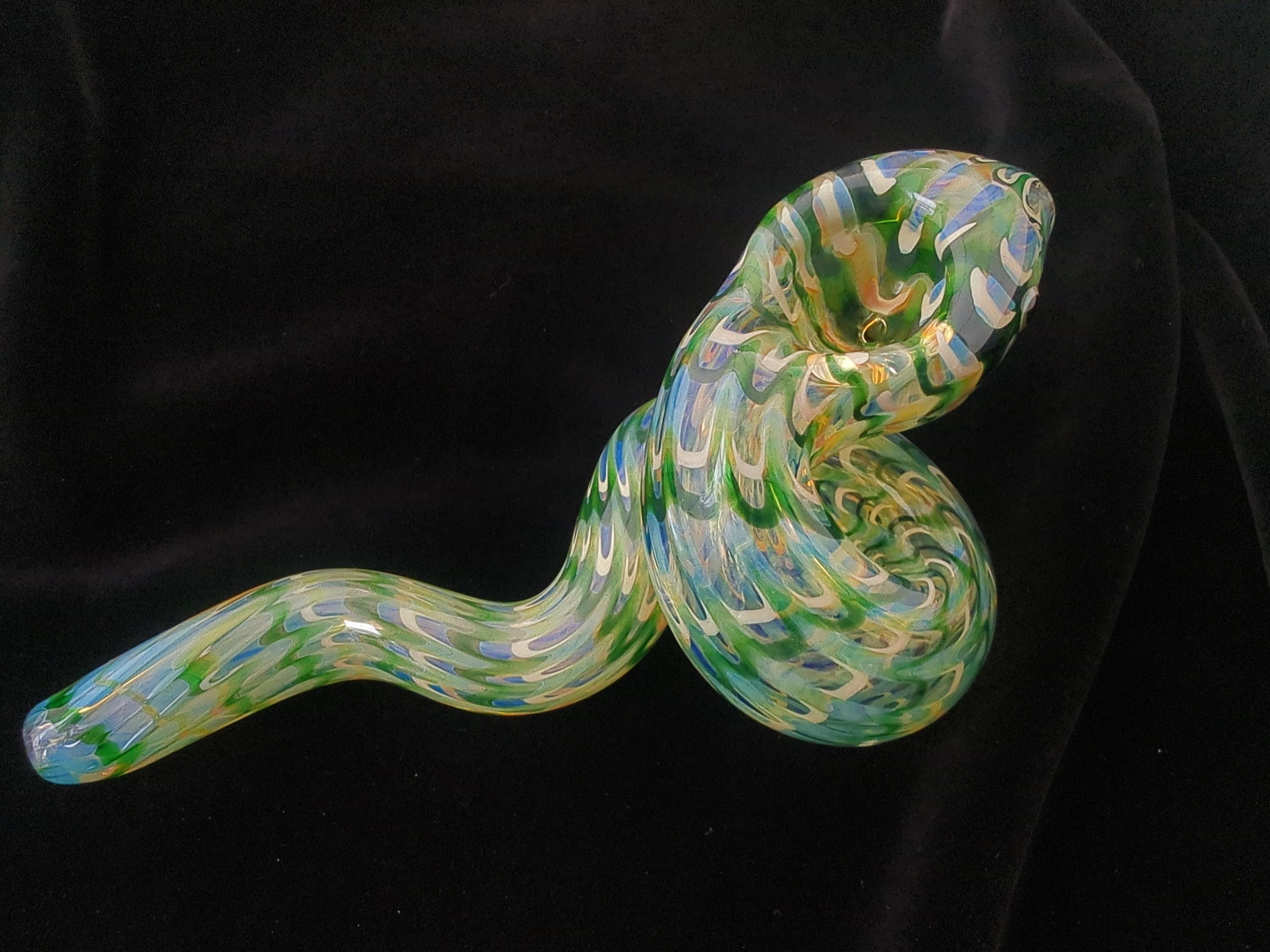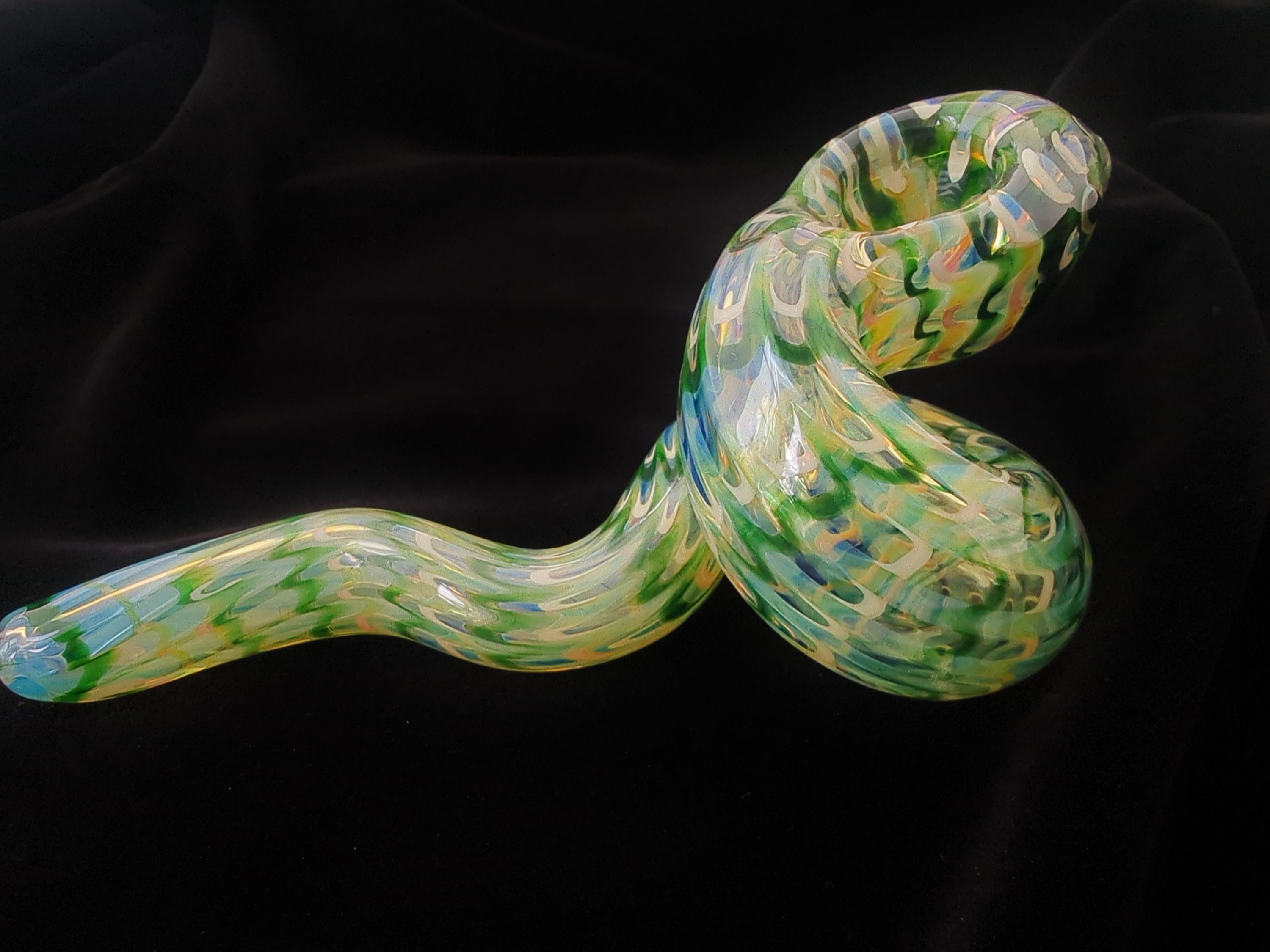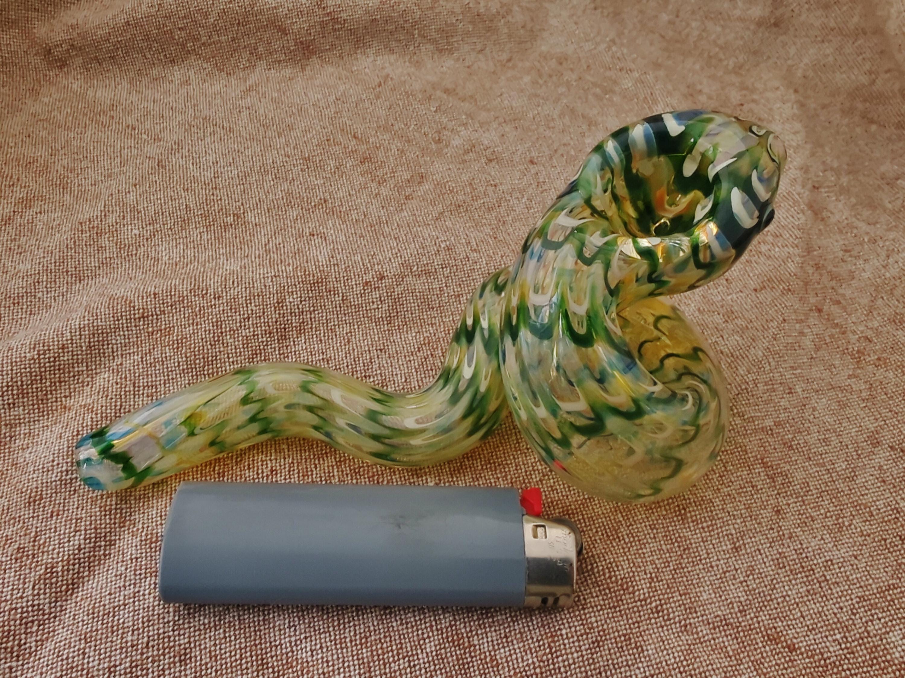 This colorful glass snake pipe seems ready to slither off the table. It has graceful curves, beautiful colors, and many details. If you could uncoil this, you would find that it's a longer pipe than you expected; it also gives a cooler smoke than expected because of its actual length (if it was uncurled). The lighter in the last photo is a standard sized Bic.