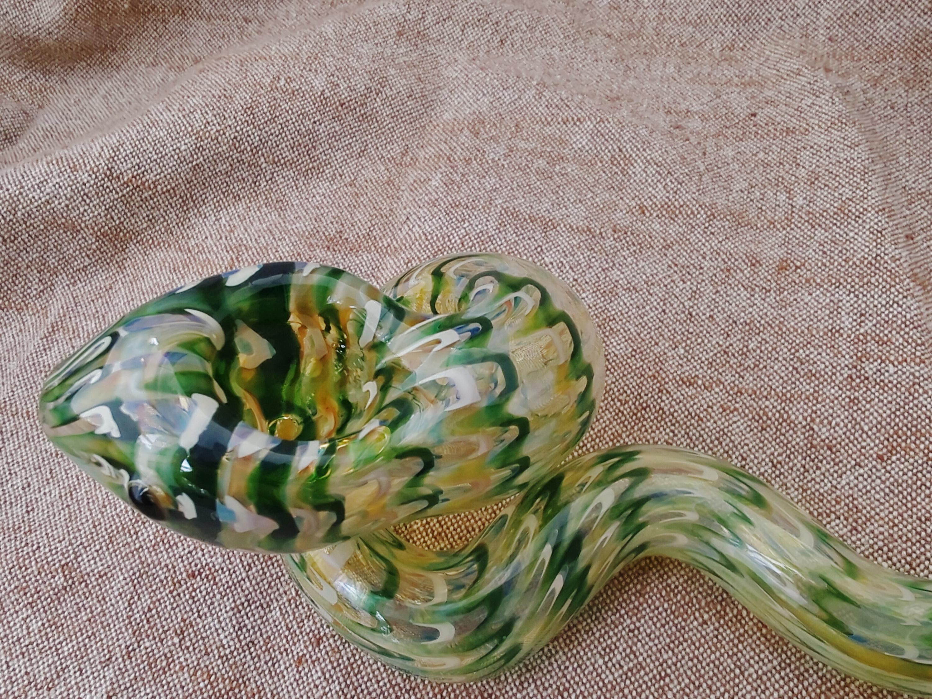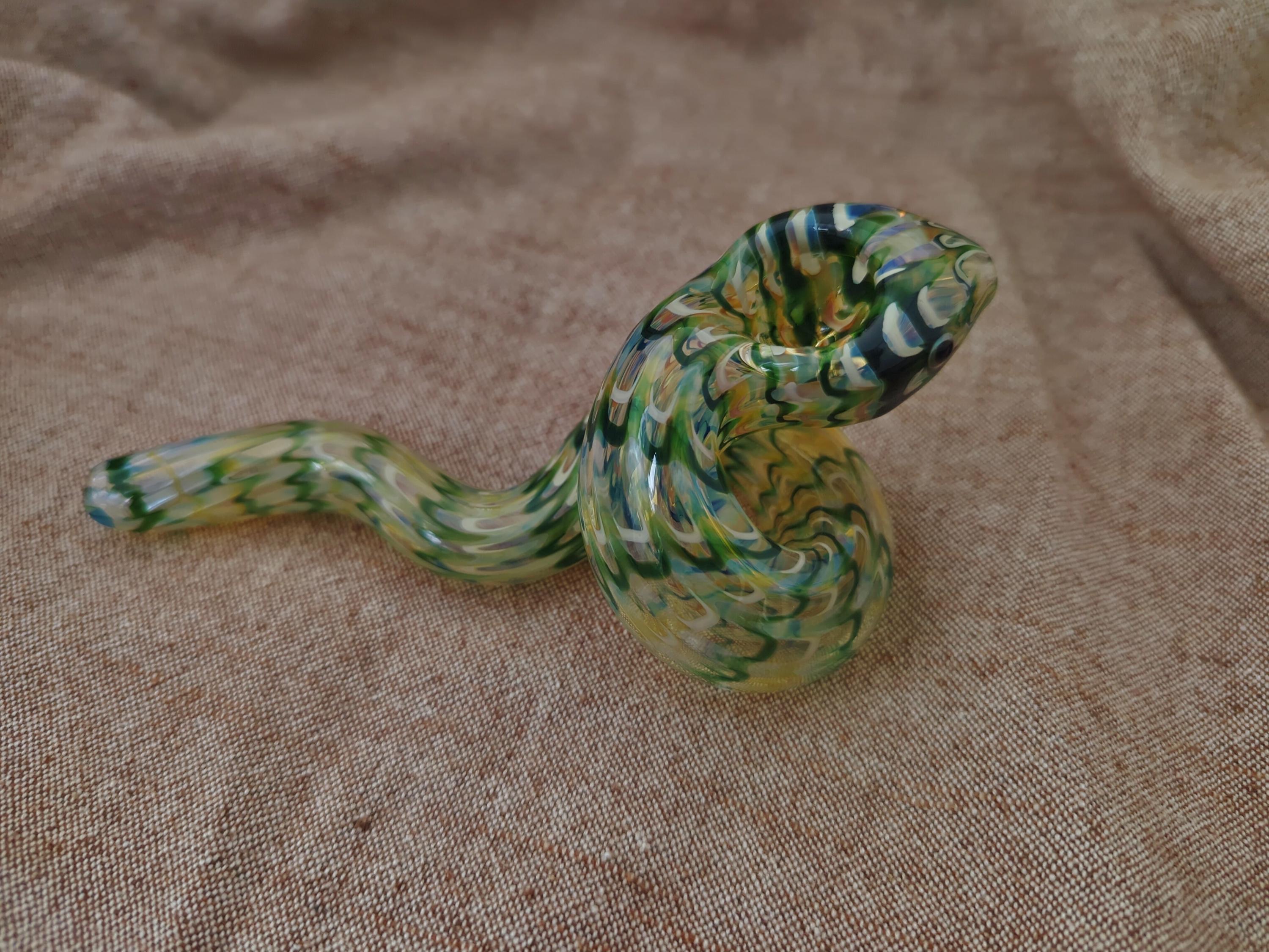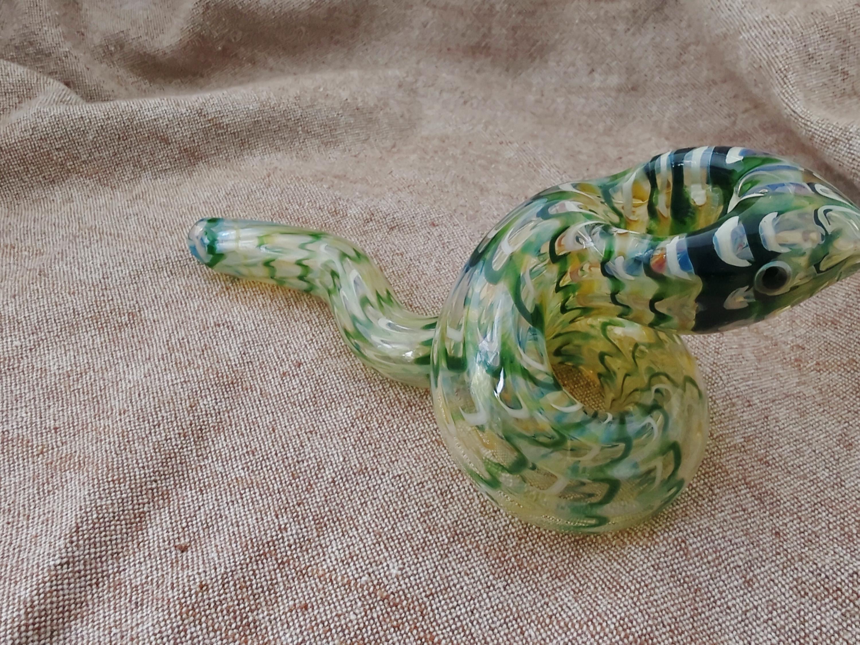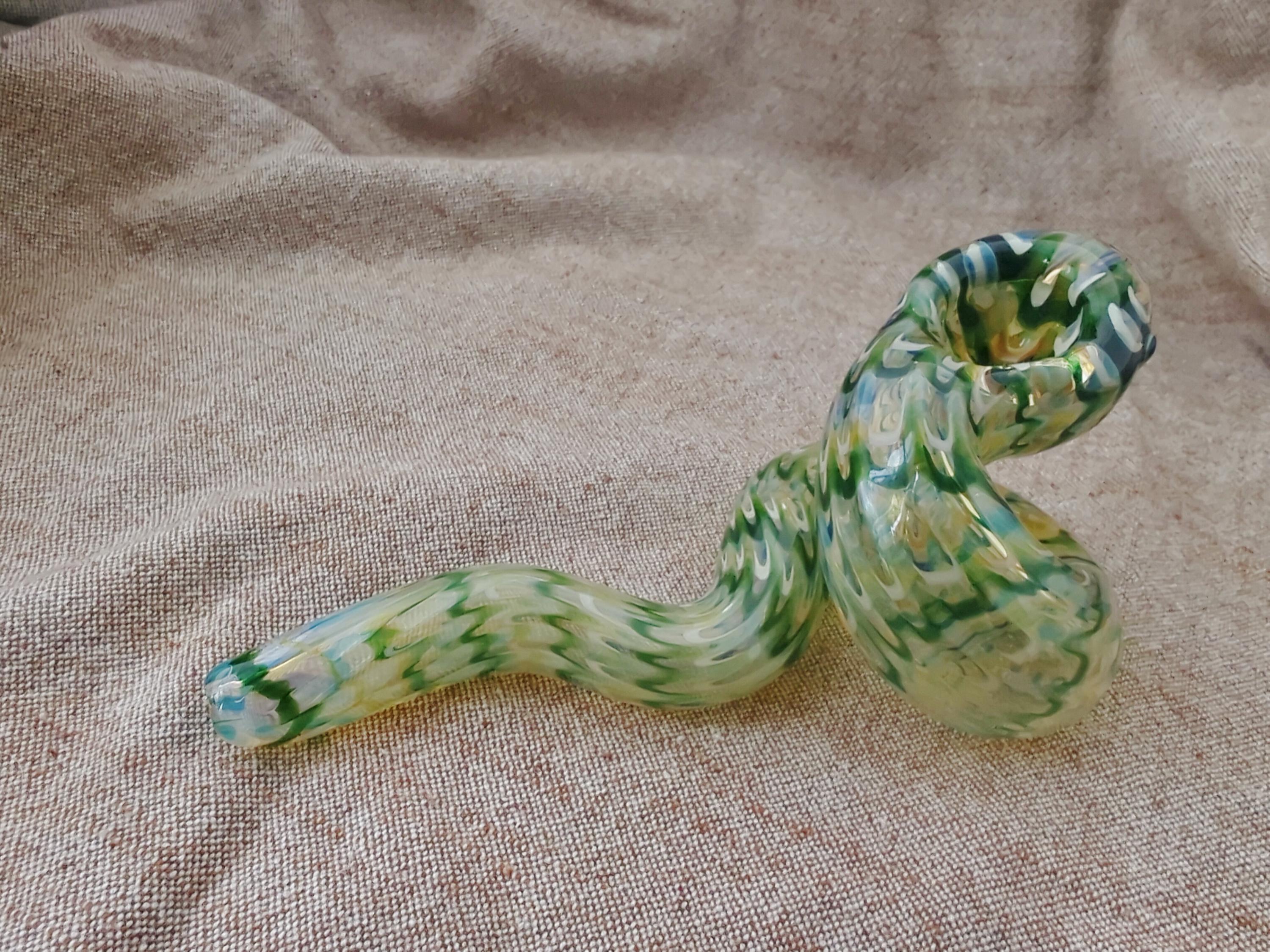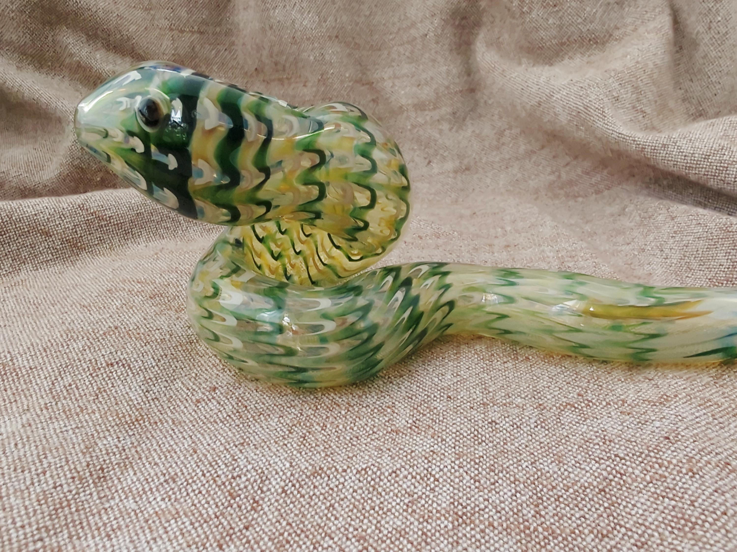 This colorful glass snake pipe seems ready to slither off the table. It has graceful curves, beautiful colors, and many details. If you could uncoil this, you would find that it's a longer pipe than you expected; it also gives a cooler smoke than expected because of its actual length (if it was uncurled). The lighter in the last photo is a standard sized Bic.