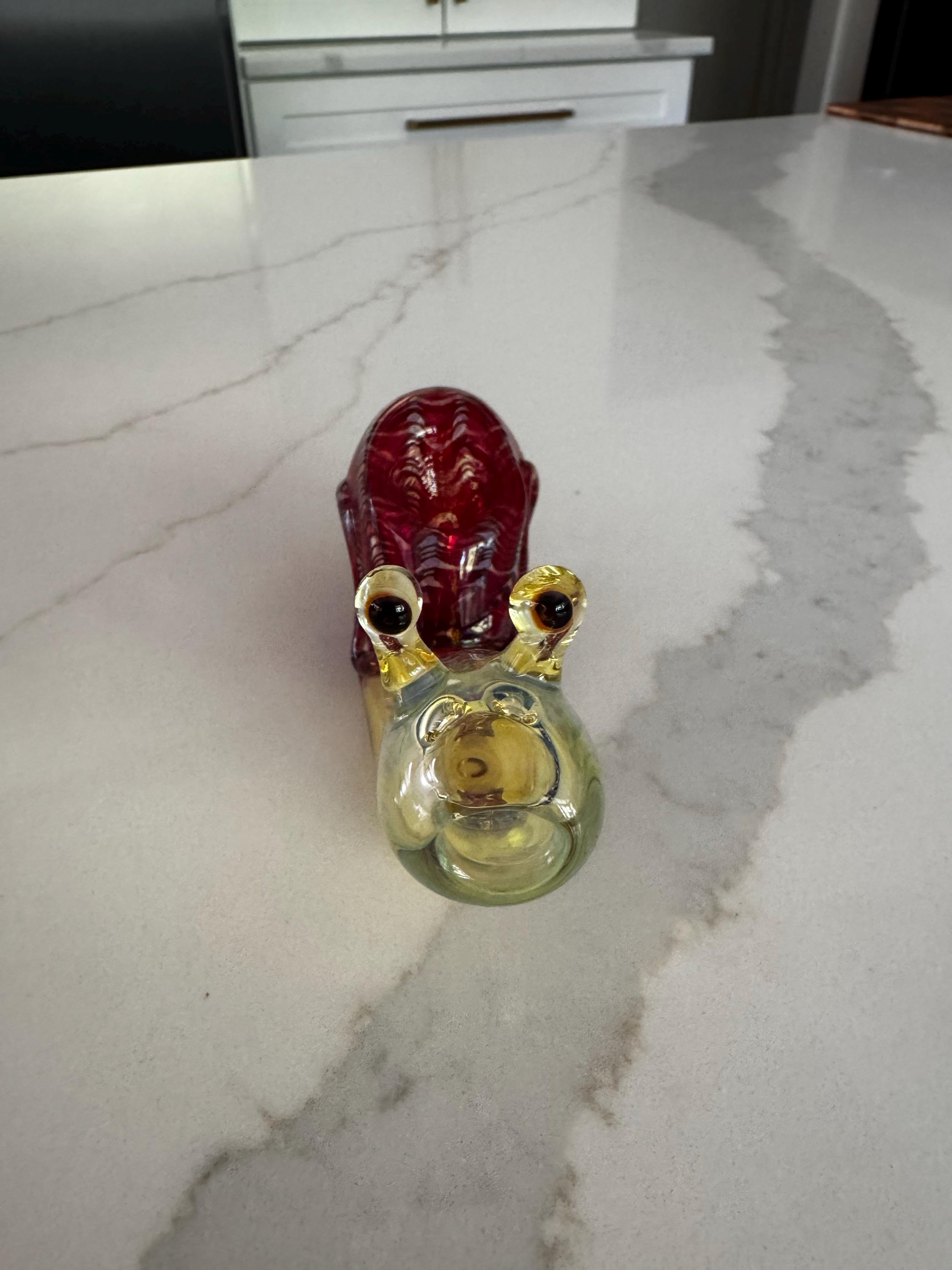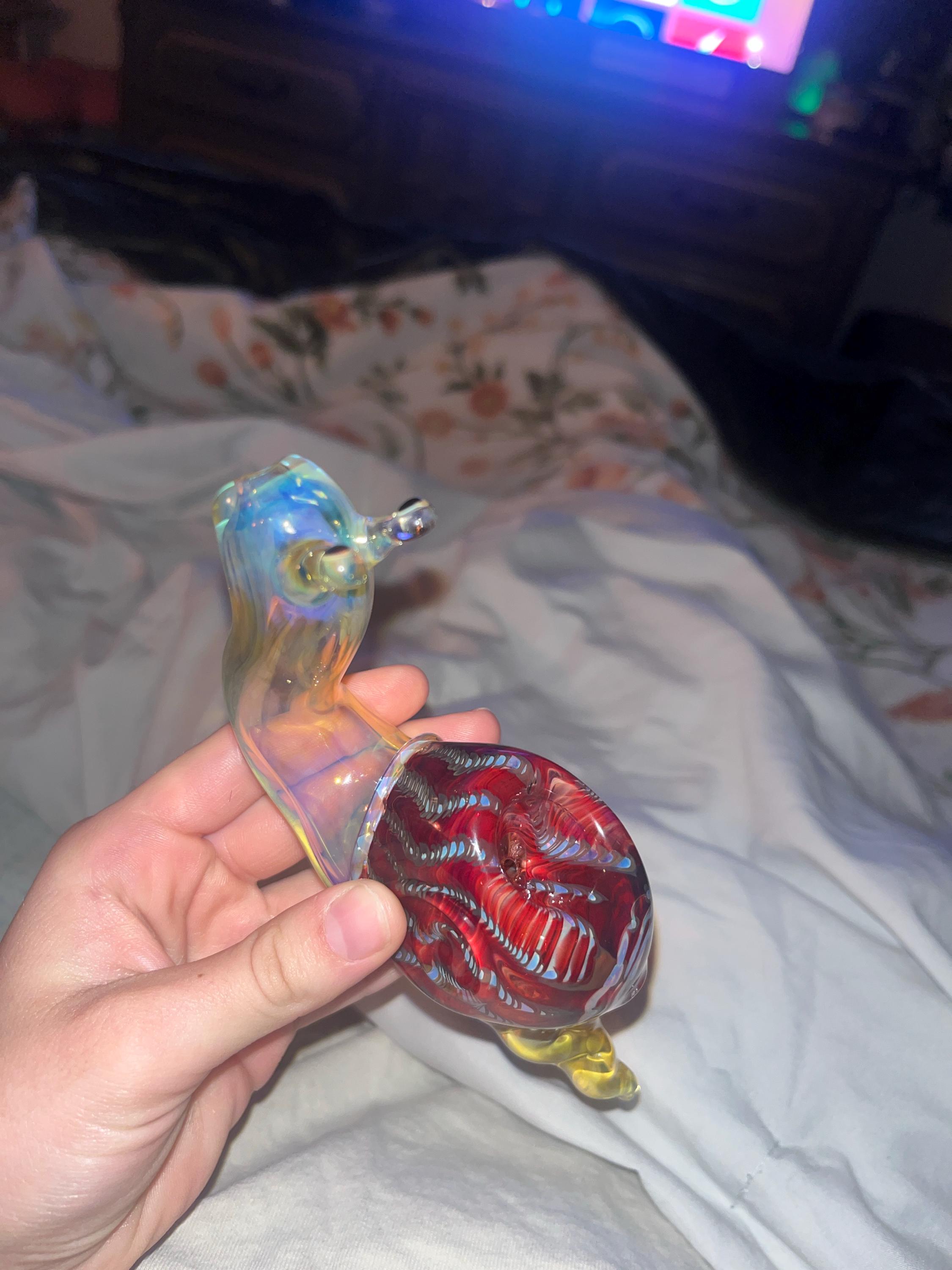 This beautiful, vibrant snail pipe has been meticulously sculpted to include many fine details. A gracefully curving body and tail, a colorful spiraling shell, a smiling face, and the many other details make it seem to be ready to slither away. The lighter in the last photo is a standard sized Bic.